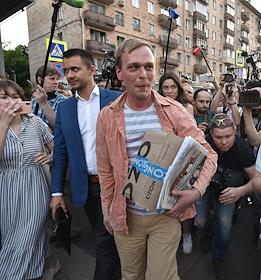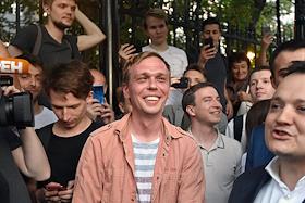 Корреспондент интернет-издания "Медуза" Ивана Голунов (в центре) во время выхода из здания главного следственного управления МВД по Москве после снятия с него всех обвинений по делу о покушении на сбыт наркотических веществ.