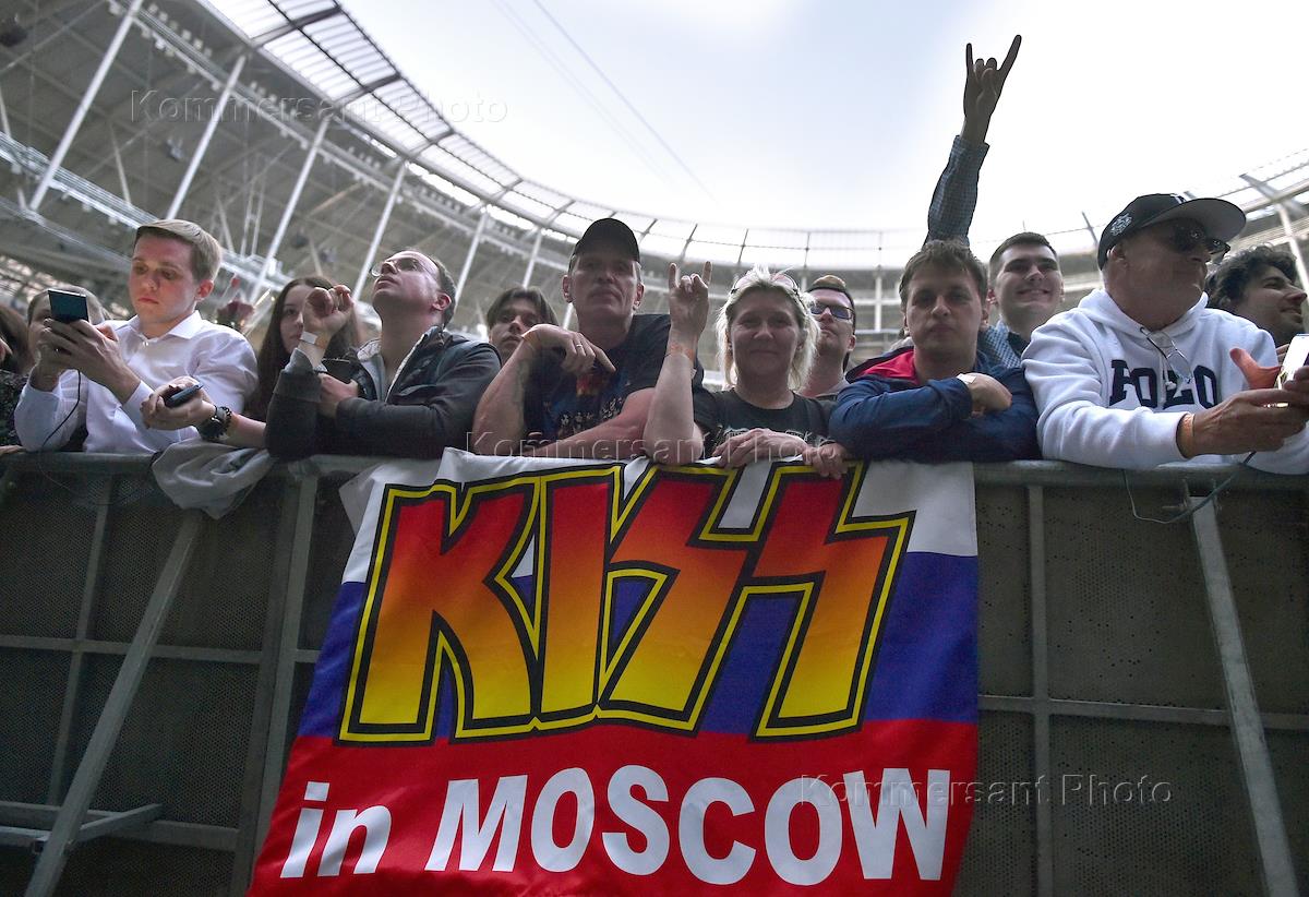Зрители на концерте группы KISS во Дворце спорта "ВТБ Арена". Плакат с надписсью "KISS в Москве".