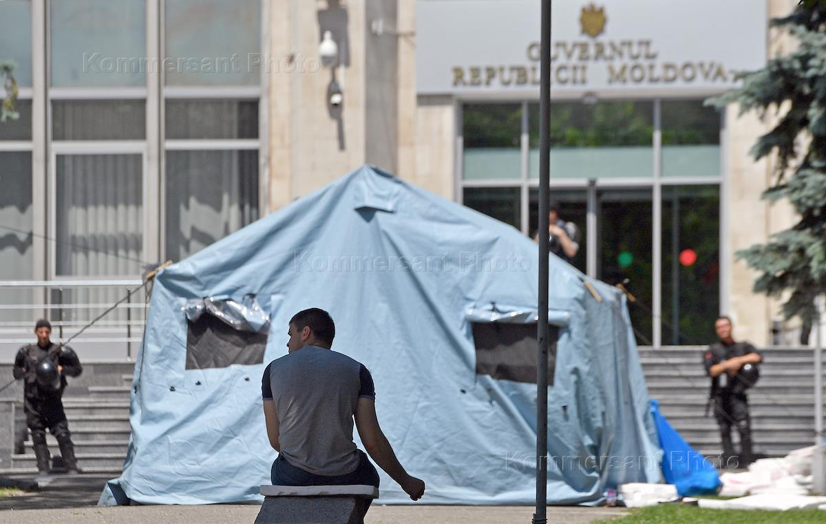 The political situation in Moldova. Campground outside the Government House of the Republic of Moldova. Law enforcement officers on duty.