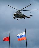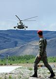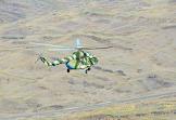 Летние учения 55-й отдельной мотострелковой бригады (горной) Центрального военного округа. Вертолет МИ-8АМТШ во время полета над городом Кызыл.