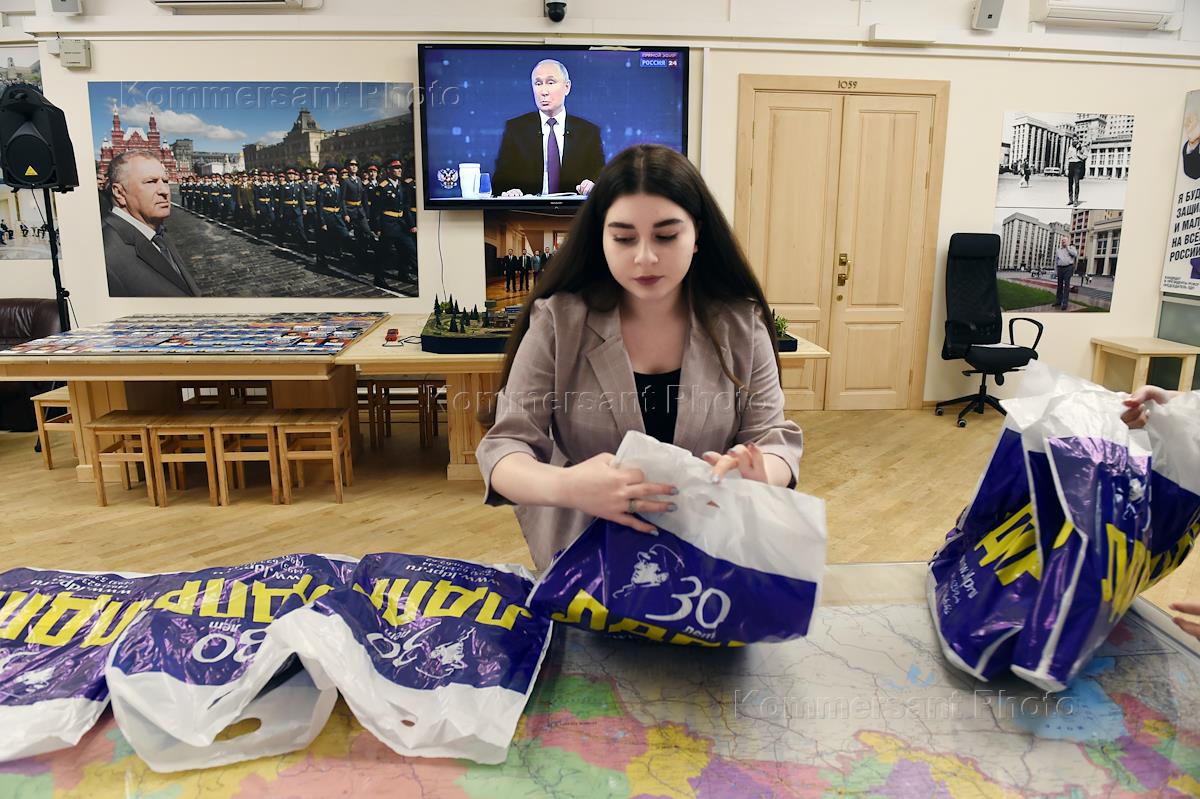 Жанровая фотография. Трансляция ежегодной "Прямой линии" с президентом России Владимиром Путиным в зале заседаний фракции ЛДПР в Государственной думы России.
