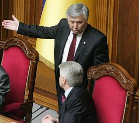 Премьер-министр Украины Юрий Ехануров (слева) и председатель Верховной Рады Украины (ВРУ) Владимир Литвин (справа) во время закрытия заключительного заседания девятой сессии Верховной Рады Украины четвертого созыва.