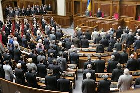 Заключительное заседание девятой сессии Верховной Рады Украины (ВРУ) четвертого созыва. Депутаты стоят во время исполнения государственного гимна.
