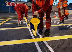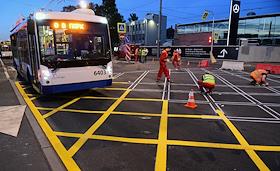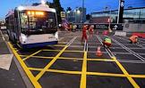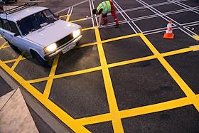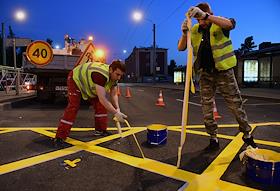 Демонстрационные работы по нанесению разметки 1.26 (вафля) на перекрёстке Светлановского проспекта и улицы Орбели.