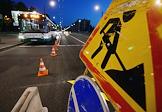 Жанровая фотография. Знак "Дорожные работы" на проезжей части на фоне движения транспорта.
