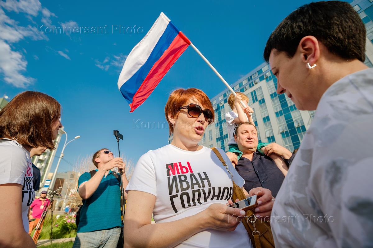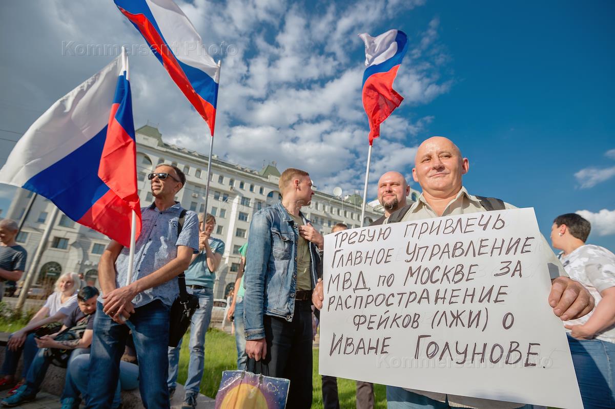 Участники митинга за свободу слова и против произвола сотрудников правоохранительных органов. Футболка с надписью "Мы Иван Голунов!".