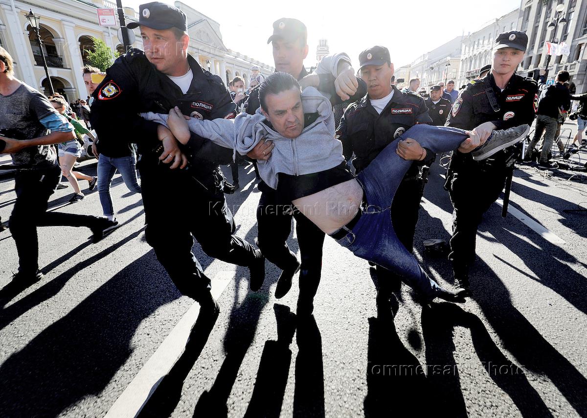 Несогласованная с местными властями акция "Общество требует справедливости" в поддержку корреспондента интернет-издания "Медуза" Ивана Голунова с целью привлечения общественного внимания к политическим репрессиям и фабрикации уголовных дел, прошла возле Гостиного двора. Сотрудники полиции во время задержания участника акции.