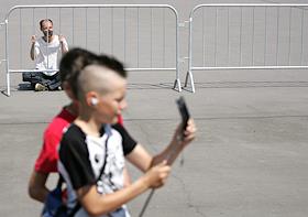 Митинг против политических репрессий, организованный либертарианской партией, прошел на площади Ленина. Жанровая фотография. Мужчина сидит на асфальте у ограждения места проведения митинга.