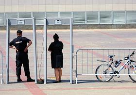 Митинг против политических репрессий, организованный либертарианской партией, прошел на площади Ленина. Сотрудники полиции у рамок металлоискателя.