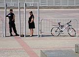 Митинг против политических репрессий и за свободу слова, организованный Либертарианской партией, на площади Ленина. Сотрудники полиции у рамок металлоискателей во время митинга.
