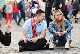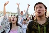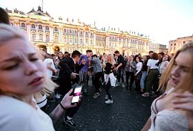 Праздник выпускников "Алые паруса". Туристы на Дворцовой площади.