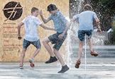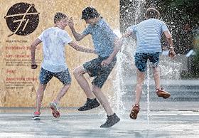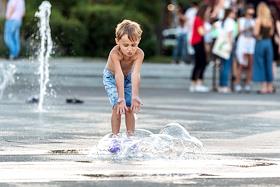 Жанровая фотография. Жара в городе. Мальчик на площади у фонтана.