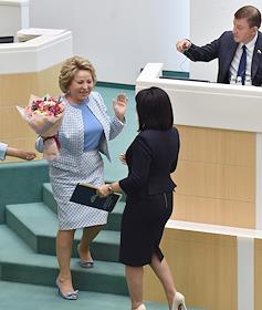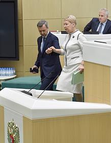 Заседание Совета Федерации (СФ) России. Представитель в СФ России от исполнительного органа государственной власти Приморского края Светлана Горячева (слева) и представитель в СФ России от исполнительного органа государственной власти Пермского края Андрей Климов (справа) во время заседания.