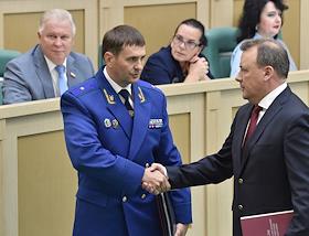 Пленарное заседание Совета Федерации (СФ) России. Ззаместитель Генерального прокурора России Дмитрий Демешин (в центре) во время заседания.
