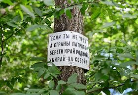 Деревня Кирьясало- столица республики Северная Ингрия в 1919-1920 годах. Жанровая фотография. Табличка патриотического содержания на дереве.
