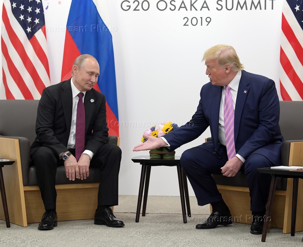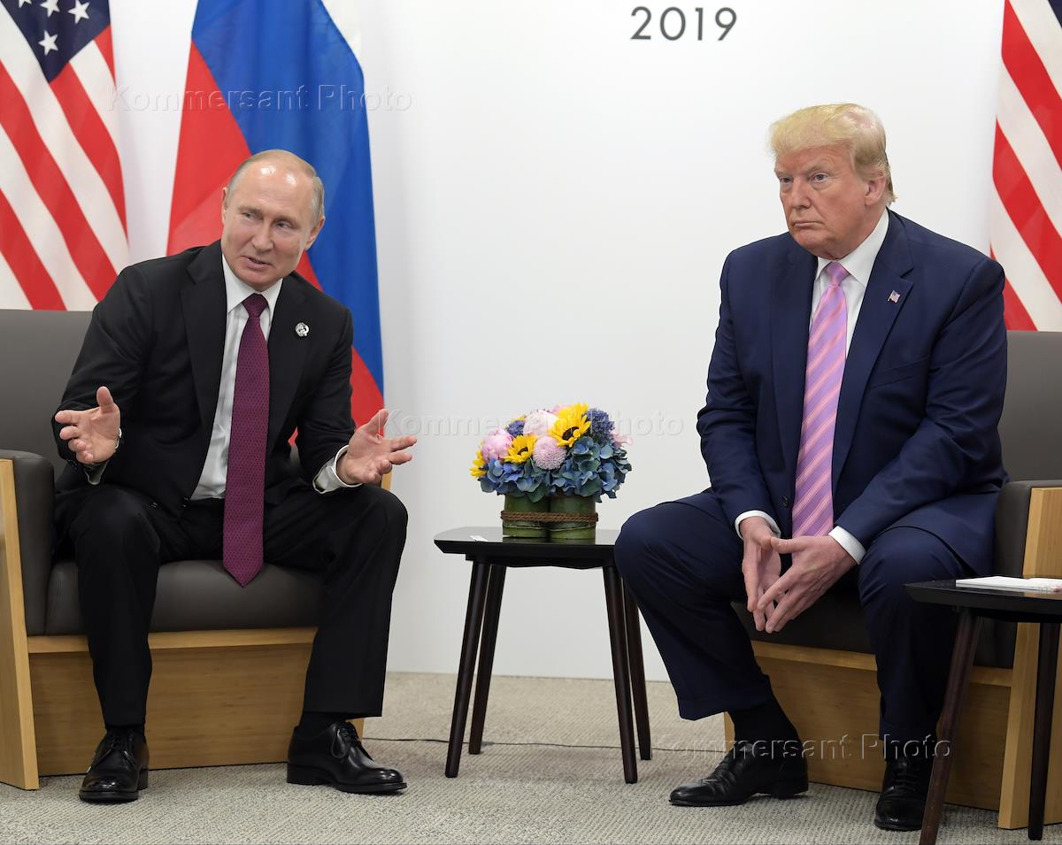 Рабочая поездка президента России Владимира Путина в Японию. XIV саммит лидеров стран Группы двадцати (G20) в международном выставочном комплексе INTEX Osaka. Президент России Владимир Путин (слева) и президент США Дональд Трамп (справа) во время встречи.