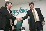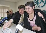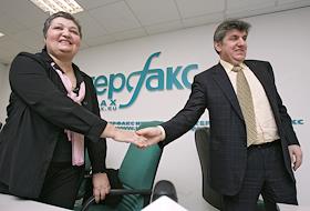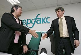 Президент союза армян России Ара Абрамян (слева) и лидер таджикской диаспоры Гавхар Джураева (справа) во время пресс-конференции на тему: "Угроза ксенофобии и неонацизма - позиция и роль общественных национальных организаций". Пресс-конференция прошла в центральном офисе агентства "Интерфакс".