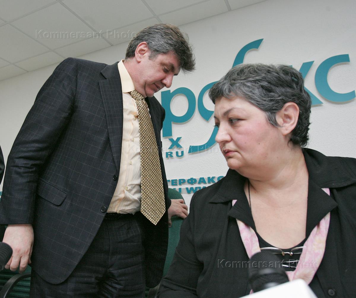Президент союза армян России Ара Абрамян (слева) и лидер таджикской диаспоры Гавхар Джураева (справа) во время пресс-конференции на тему: "Угроза ксенофобии и неонацизма - позиция и роль общественных национальных организаций". Пресс-конференция прошла в центральном офисе агентства "Интерфакс".