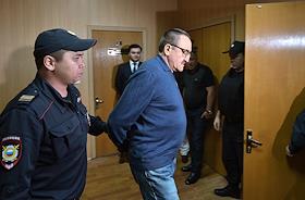 Бывший руководитель Управления Федеральной антимонопольной службы (УФАС) России по Дагестану Кубасай Кубасаев (в центре), обвиняемый в получении взяток на сумму более 2,5 миллиона рублей, во время заседания Лефоротовского районного суда.
