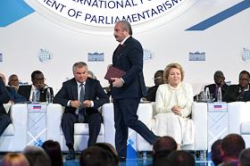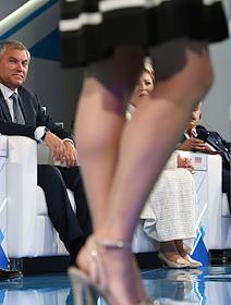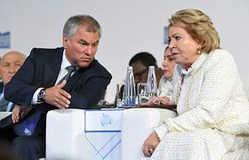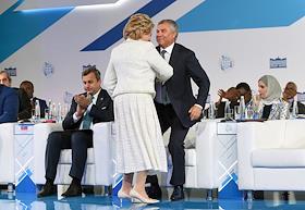 II Международный форум "Развитие парламентаризма" в Центре международной торговли (ЦМТ). Председатель Государственной думы России Вячеслав Володин (слева) и председатель Совета Федерации России Валентина Матвиенко (справа) во время форума.