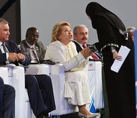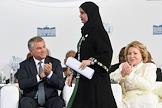 II Международный форум "Развитие парламентаризма" в Центре международной торговли (ЦМТ). Председатель Совета Федерации России Валентина Матвиенко (слева) и председатель Федерального Национального Совета Объединенных Арабских Эмиратов (ОАЭ) Амаль Абдалла Аль-Кубейси (справа) во время форума.