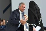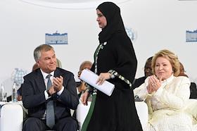 II Международный форум "Развитие парламентаризма" в Центре международной торговли (ЦМТ). Слева направо: председатель Государственной думы России Вячеслав Володин, председатель Совета Федерации России Валентина Матвиенко и председатель Федерального Национального Совета Объединенных Арабских Эмиратов (ОАЭ) Амаль Абдалла Аль-Кубейси во время форума.
