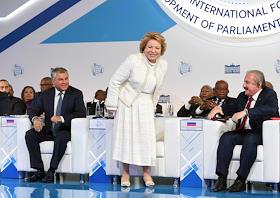 II Международный форум "Развитие парламентаризма" в Центре международной торговли (ЦМТ). Слева направо: председатель Государственной думы России Вячеслав Володин, председатель Совета Федерации России Валентина Матвиенко и председатель Великого национального собрания Турции Мустафа Шентоп во время форума.