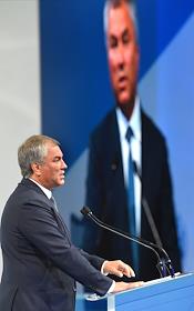 II Международный форум "Развитие парламентаризма" в Центре международной торговли (ЦМТ). Председатель Государственной думы России Вячеслав Володин во время форума.
