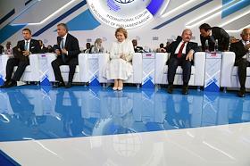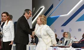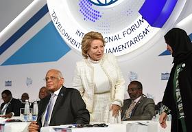 II Международный форум "Развитие парламентаризма" в Центре международной торговли (ЦМТ). Слева направо: председатель Палаты депутатов Египета Али Абдель Аал Сайед Ахмед, председатель Совета Федерации России Валентина Матвиенко и председатель Федерального Национального Совета Объединенных Арабских Эмиратов (ОАЭ) Амаль Абдалла Аль-Кубейси во время форума.