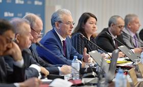 Заседание Центральной избирательной комиссии (ЦИК) России. Член ЦИК России Валерий Гальченко (третий слева), заместитель председателя ЦИК России Николай Булаев (в центре) и секретарь ЦИК России Майя Гришина (третья справа) во время заседания.