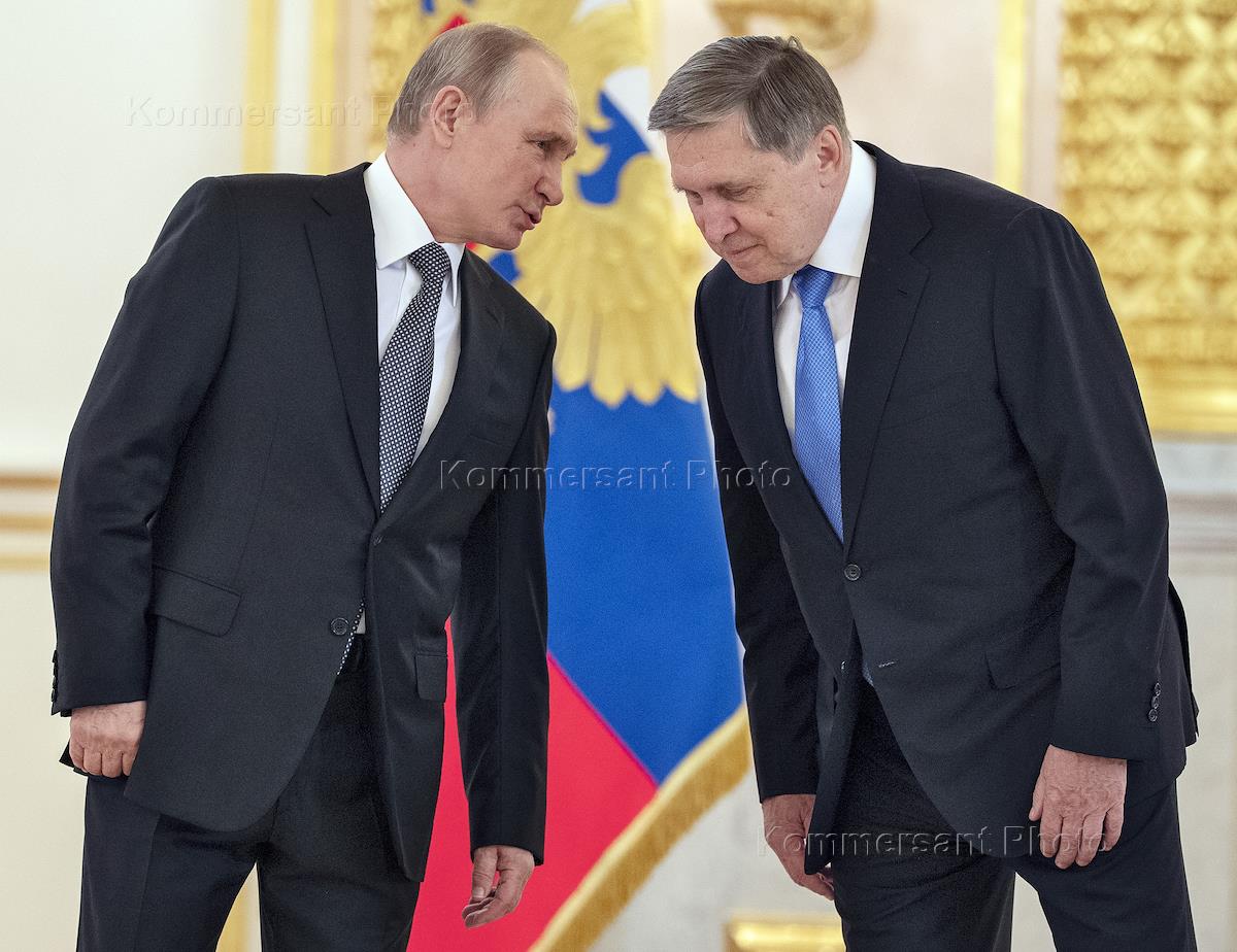 Церемония вручения верительных грамот послами иностранных государств в Александровском зале Большого Кремлевского дворца. Президент России Владимир Путин (слева) и помощник президента России Юрий Ушаков (справа) во время церемонии.