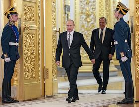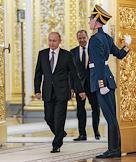 Церемония вручения верительных грамот послами иностранных государств в Александровском зале Большого Кремлевского дворца. Президент России Владимир Путин (слева) и министр иностранных дел России Сергей Лавров (справа) во время церемонии.