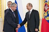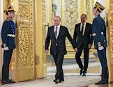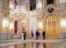 Церемония вручения верительных грамот послами иностранных государств в Александровском зале Большого Кремлевского дворца. Слева направо: министр иностранных дел России Сергей Лавров, посол Белоруссии в России Владимир Семашко и президент России Владимир Путин во время церемонии.