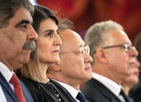 Церемония вручения верительных грамот послами иностранных государств в Александровском зале Большого Кремлевского дворца. Слева направо: посол Мавритании в России Хамед Хамуни, посол Афганистана в России Мохаммад Латиф Баханд и посол Греции в России Тасия Афанасиу во время церемонии.