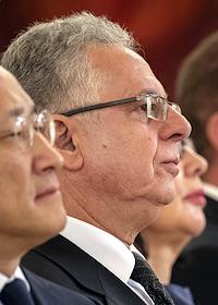 Церемония вручения верительных грамот послами иностранных государств в Александровском зале Большого Кремлевского дворца. Слева направо: посол Афганистана в России Мохаммад Латиф Баханд, посол Греции в России Тасия Афанасиу и посол Республики Корея в России Ли Сок Пэ во время церемонии.
