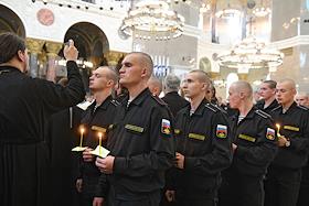 Панихида по погибшим в Баренцевом море морякам-подводникам прошла в главном храме российских моряков - Кронштадтском морском соборе святителя Николая Чудотворца. Военнослужащие во время панихиды.