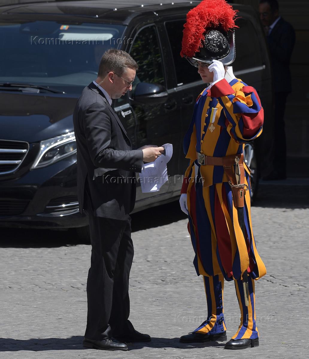 Рабочая поездка президента России Владмира Путина в Ватикан. Президент России Владимир Путин (слева) и префект Дома Его Святейшества и префект Апостольского дворца Георг Генсвайн (второй слева) в дворике Сан Дамасо Апостольского дворца перед началом встречи президента России с Папой Римским Франциском.