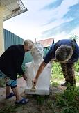 Жизнь села Алферьево. Мастер по отделке домов Владимир Столяров с супругой красят памятник писателю Максиму Горькому.