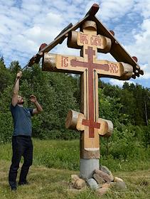 Жизнь села Алферьево. Резчик по дереву Сергей Юдин у креста, сделанного своими руками.