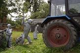 Жизнь села Алферьево. Трактор припаркован рядом с уличными скульптурами мальчика с собакой, сказочного медведя и девочки, сидящей на коробе.