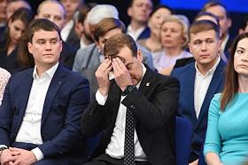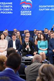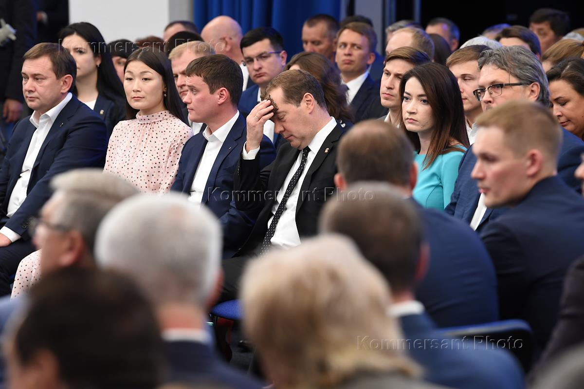 Ежегодная политическая конференция партии "Единая Россия" в формате совместного заседания Высшего и Генерального советов "Единой России". Председатель правительства России Дмитрий Медведев (в центре) на конференции.