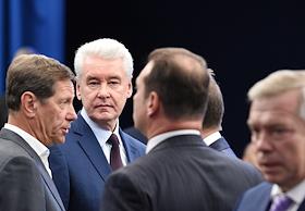 Ежегодная политическая конференция партии "Единая Россия" в формате совместного заседания Высшего и Генерального советов "Единой России". Мэр Москвы Сергей Собянин (второй слева) и первый заместитель председателя Государственной Думы России Александр Жуков (слева) перед началом конференции.