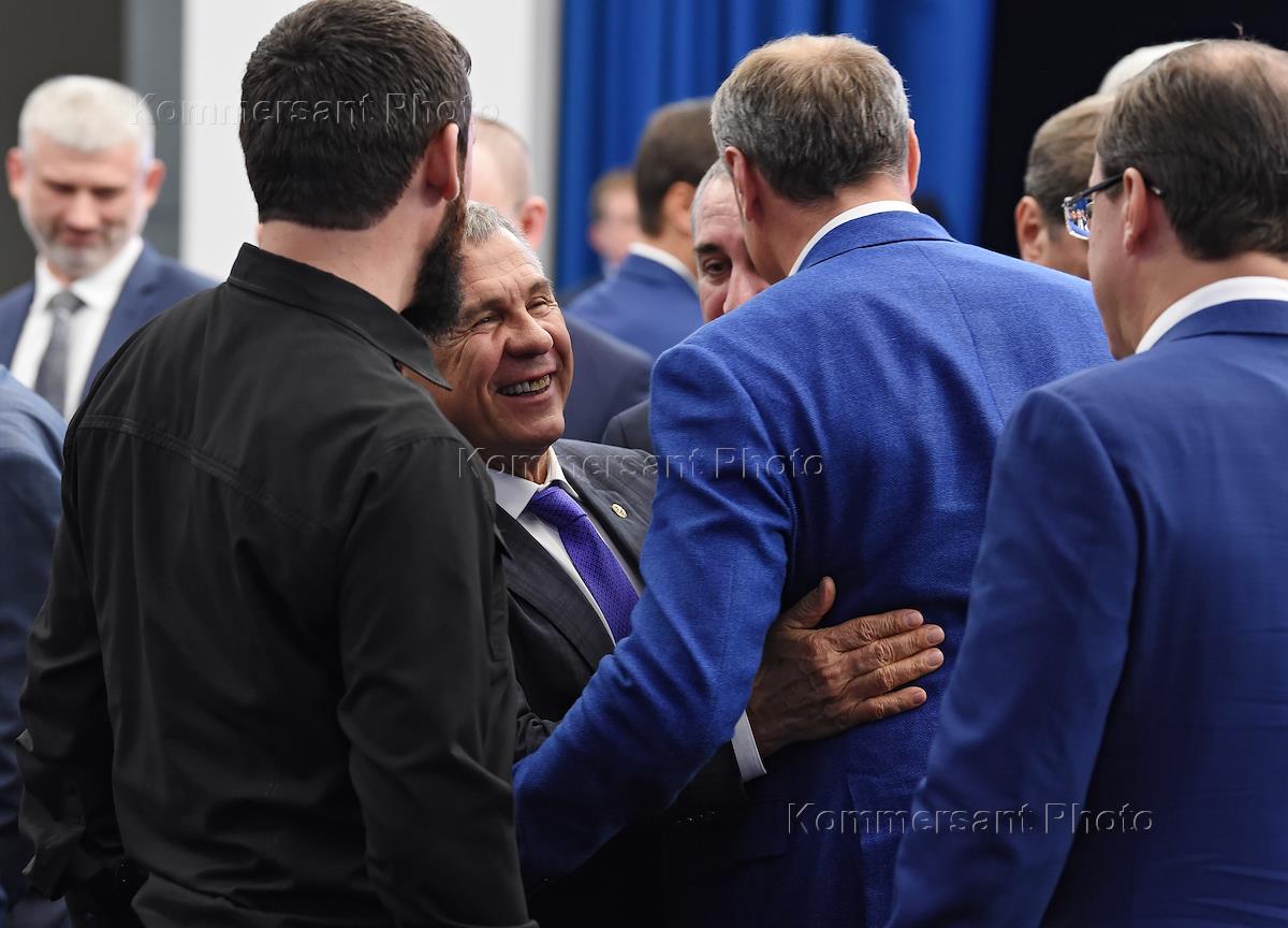Ежегодная политическая конференция партии "Единая Россия" в формате совместного заседания Высшего и Генерального советов "Единой России". Президент республики Татарстан Рустам Минниханов (в центре) перед началом конференции.