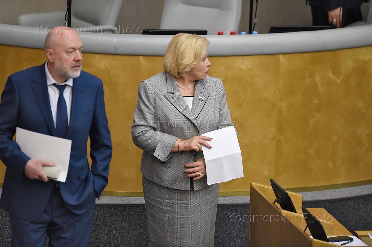 Парламентские слушания на тему "Вопросы развития цифровой экономики" в Государственной думе (ГД) России. Полномочный представитель правительства России в ГД России Александр Синенко (слева) и первый заместитель председателя комитета ГД по культуре Елена Драпеко (справа) во время слушаний.
