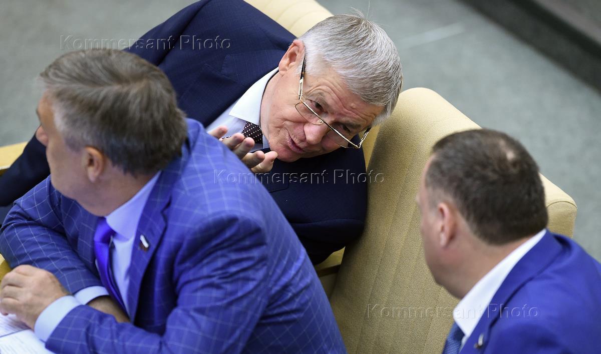 Пленарное заседание Государственной думы (ГД) России. Первый заместитель председателя комитета ГД России по безопасности и противодействию коррупции Эрнст Валеев (в центре) во время заседания.