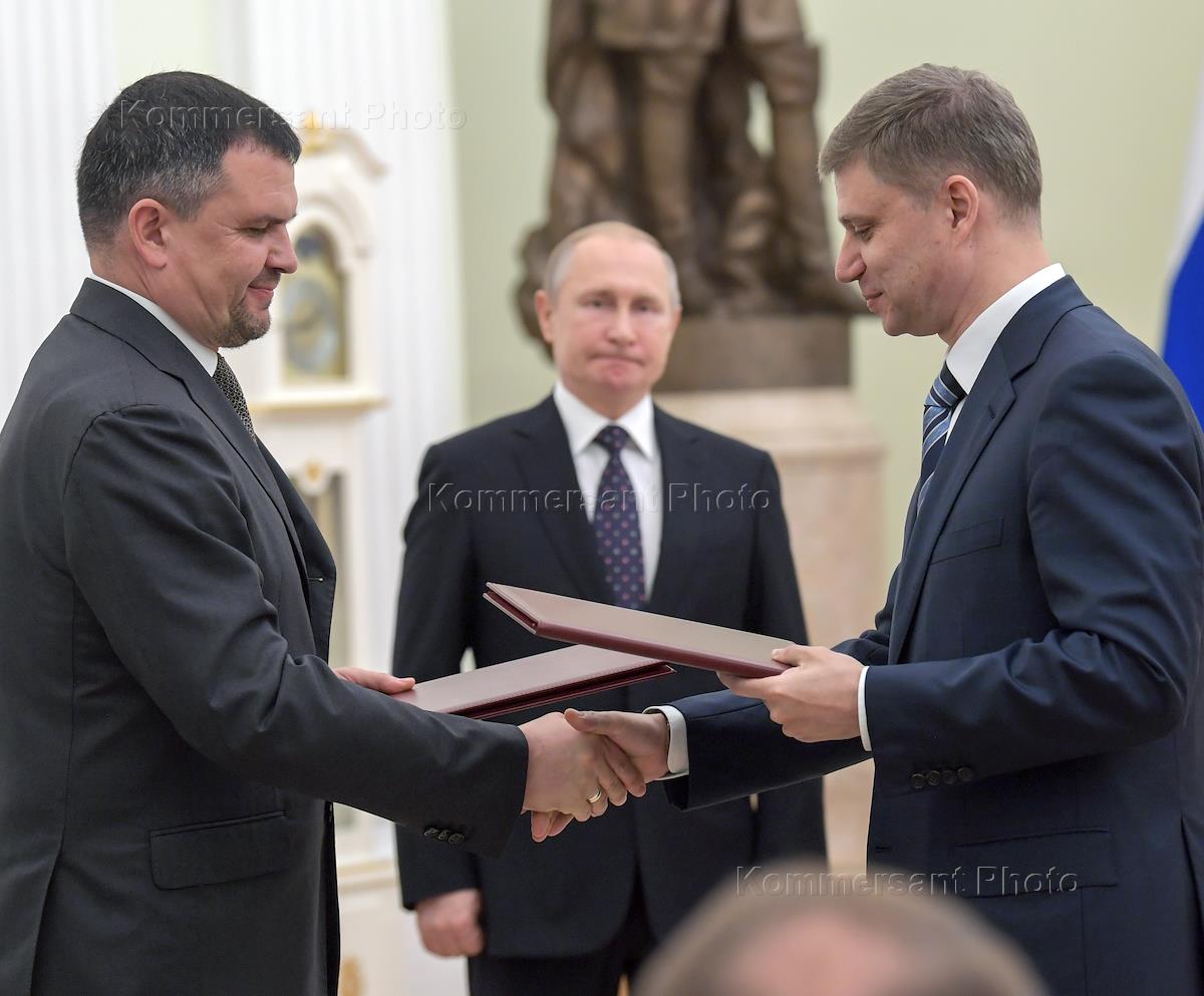 Церемония обмена соглашениями о намерениях, подписанными представителями Правительства России и крупнейших организаций с государственным участием, с целью развития отдельных высокотехнологичных направлений. Слева направо: заместитель председателя правительства России Максим Акимов, президент России Владимир Путин и генеральный директор - председатель правления ОАО "РЖД" Олег Белозеров во время церемонии.