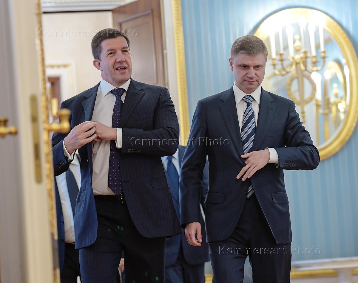 Церемония обмена соглашениями о намерениях, подписанными представителями Правительства России и крупнейших организаций с государственным участием, с целью развития отдельных высокотехнологичных направлений. Президент ПАО "Ростелеком" Михаил Осеевский (слева) и генеральный директор - председатель правления ОАО "РЖД" Олег Белозеров (справа) перед началом церемонии.