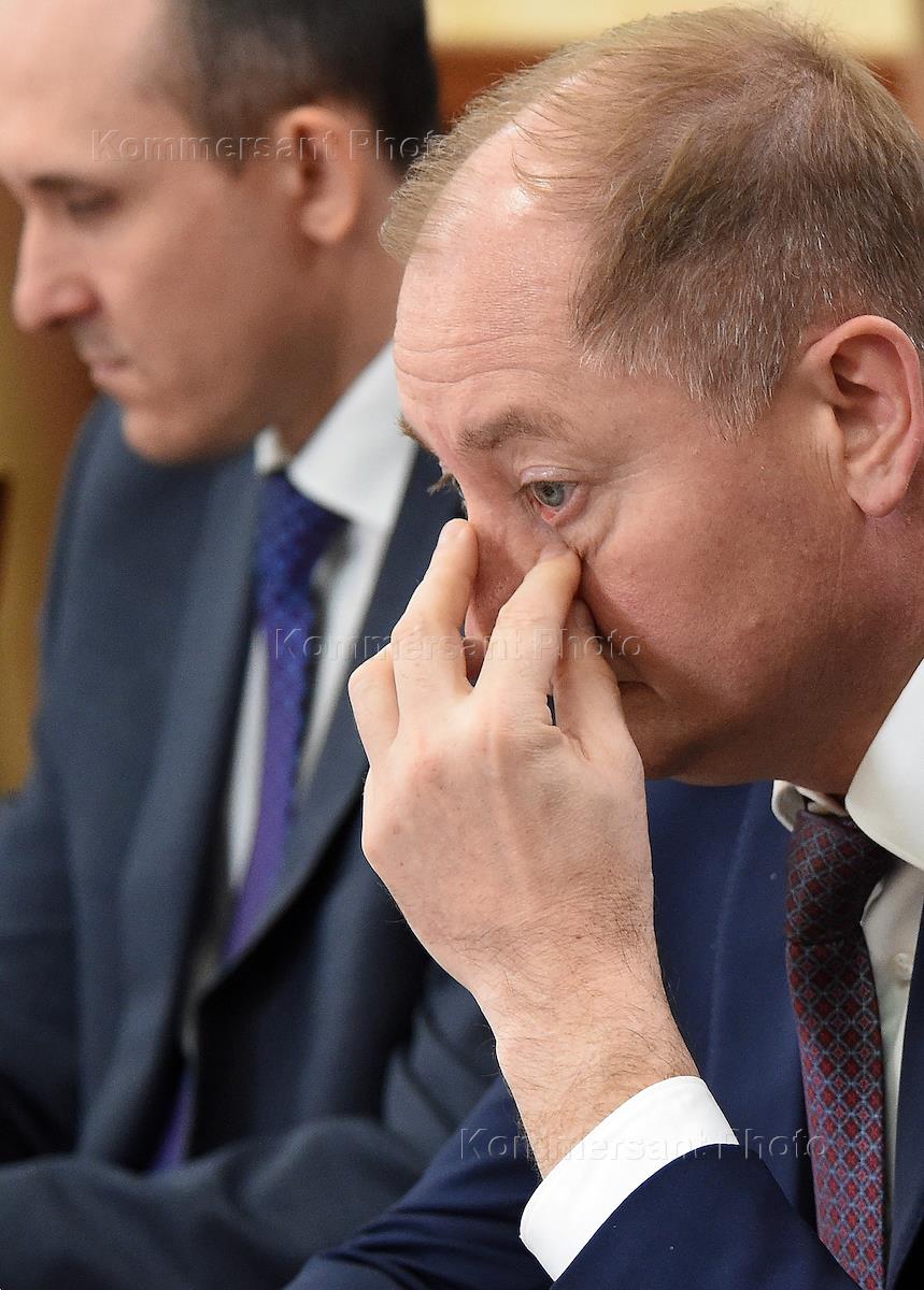 Working visit of Russian Prime Minister Dmitry Medvedev to Stavropol. Meeting on the issue "On measures aimed at ensuring the timely and high-quality construction of facilities in the framework of national projects." Russian Health Minister Veronika Skvortsova (left) and Russian Minister of Construction and Housing and Communal Services Vladimir Yakushev (right) during a meeting.