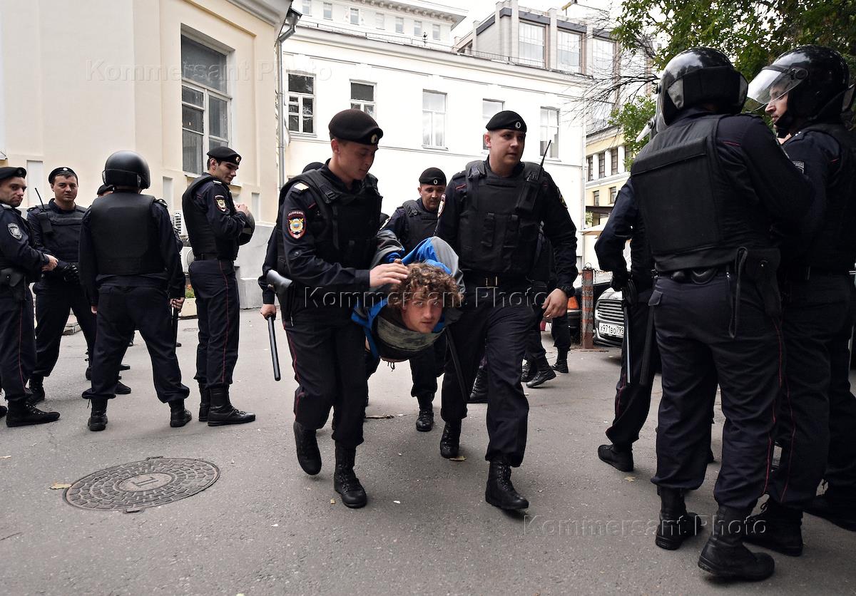 Акция в поддержку независимых кандидатов в депутаты Московской городской думы у здания Московской городской избирательной комиссии (Мосгоризбирком). Сотрудники полиции во время задержания учатсников акции.