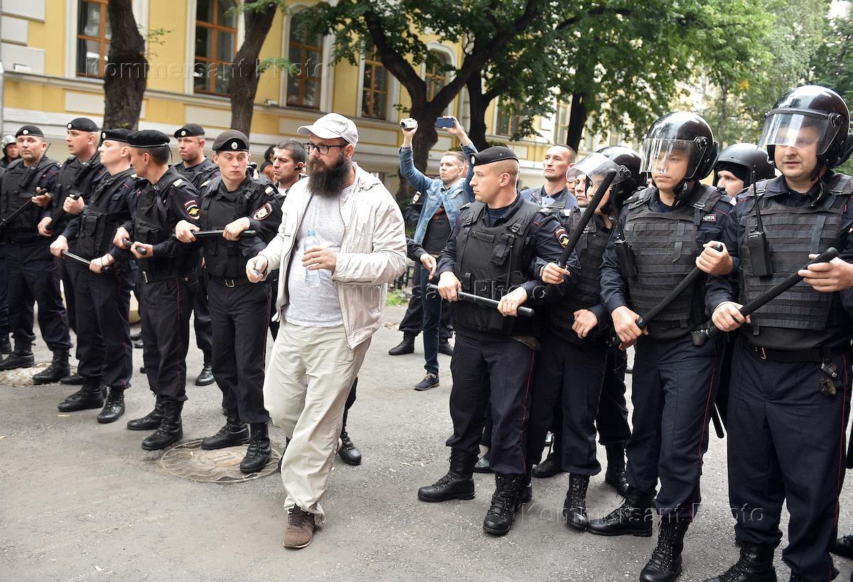 Акция в поддержку независимых кандидатов в депутаты Московской городской думы у здания Московской городской избирательной комиссии (Мосгоризбирком). Сотрудники полиции и участники во время акции.